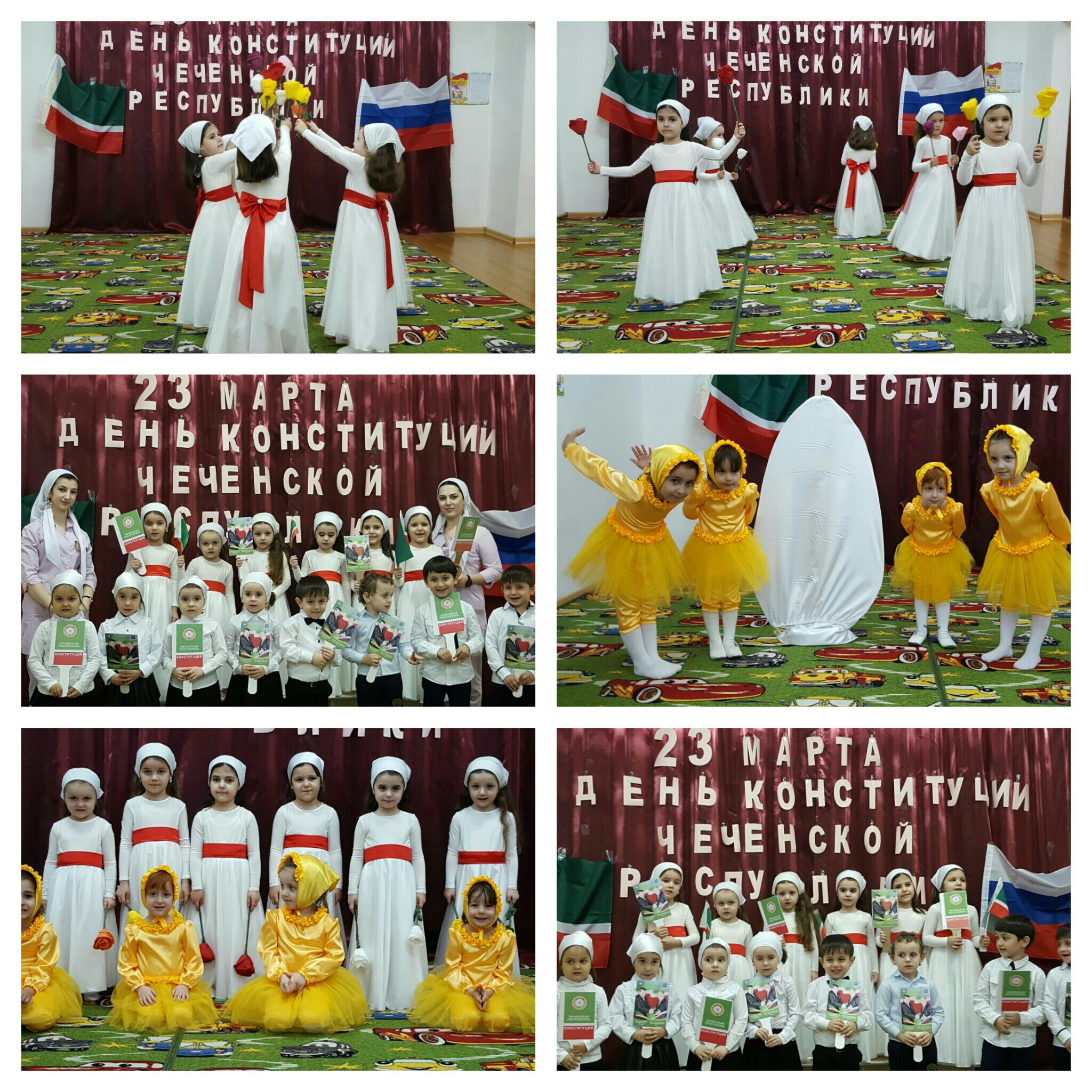 21.03.2016Сегодня в нашем саду, согласно годовому плану ДОУ, прошли тематические мероприятия, посвященные Дню Конституции Чеченской Республики: утренник, беседы. С воспитанниками были исполнены музыкальные композиции. В процессе реализации программы по духовно – нравственному воспитанию, педагоги воспитывают в детях, такие качества, как: первоначальные нравственные представления о Родине и семье, добре и зле, щедрости и жадности, послушании, доброжелательности и зависти, верности и предательстве, милосердии, чуткости, совести, благодарности, трудолюбии, любовь к Родине к другим детям (людям) и другое.