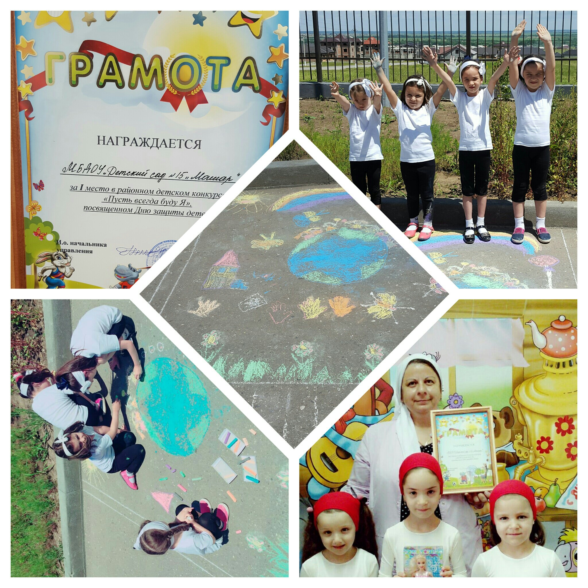 В качестве развлечения в День защиты детей конкурс рисунков на асфальте особенно хорошо подходит. Ребята рисовали солнце и небо, детей и цветы, животных и природу. По окончании конкурса все участники рассматривали рисунки, высказывали свои мнения, любовались замечательным «Островом детства» и получали сладкие подарки. Наши воспитанники в этом конкурсе приняли активное участие и заняли первое место, чем порадовали наш коллектив!