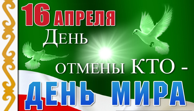 15.04.2021в Чеченской Республике. 16 апреля 2009 года Национальный антитеррористический комитет (НАК) передал экстренное сообщение об отмене режима контртеррористической операции на территории Чеченской Республики. В тот же день прошло экстренное совещание Правительства ЧР,на котором было принято решение объявить день отмены КТО в Чеченской Республике праздничным выходным днем.