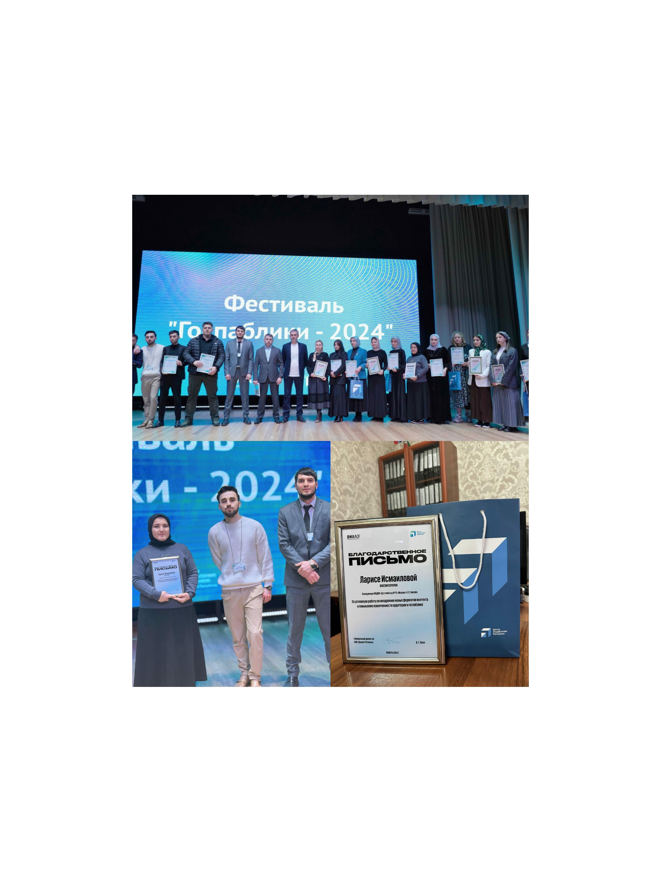 27.11.202427 ноября 2024 года в г. Грозный на фестивале "Госпаблики-2024" Исмаиловой Ларисе Ибнамасхудовне, работнику МБДОУ "Детский сад № 15 "Машар", было вручено "Благодарственное письмо" за успешную работу по внедрению новых форматов контента и повышение вовлеченности аудитории в госпаблике.