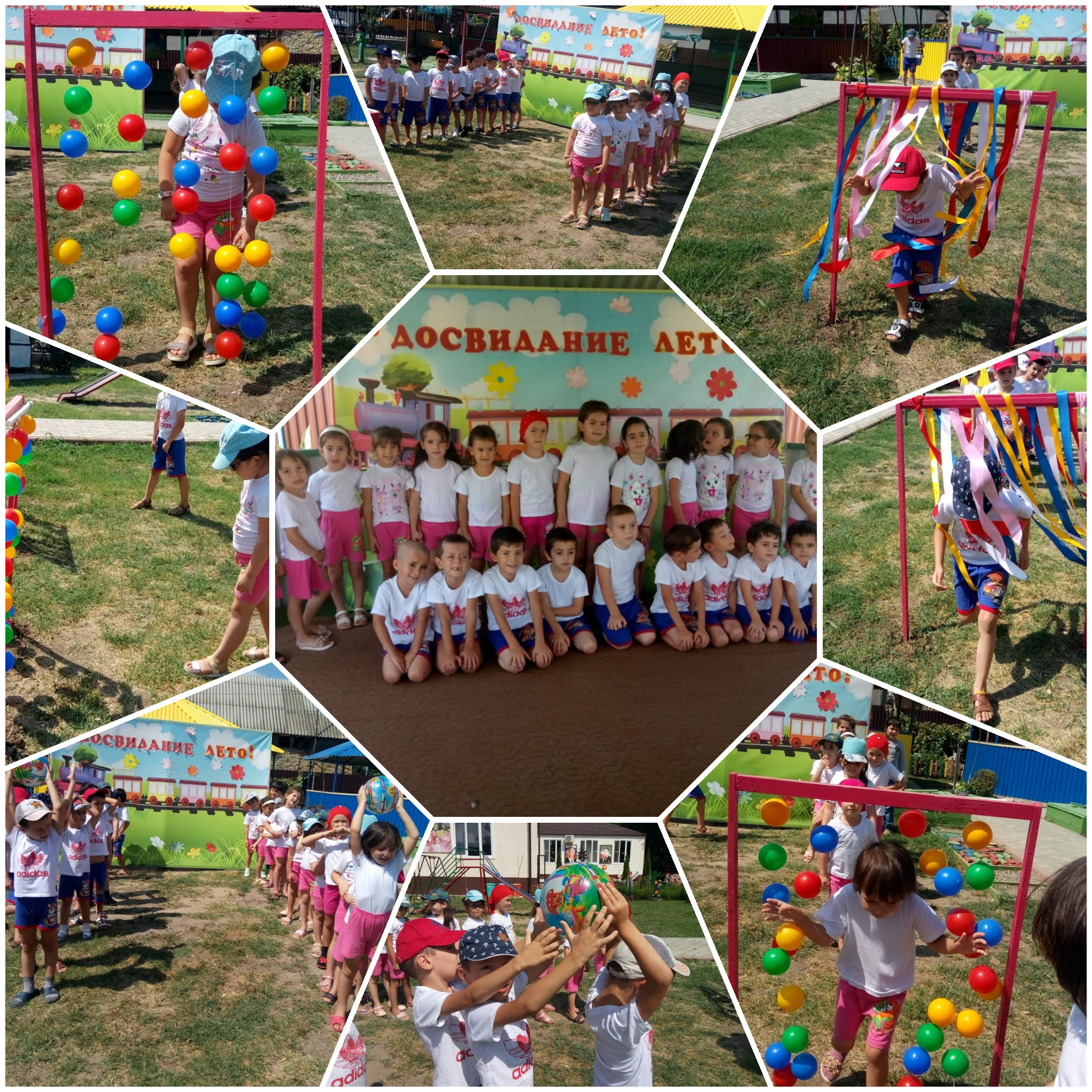 Ведущая похвалила воспитанников детского сада и сказала о том, что они все подросли, окрепли, повзрослели, стали дружными, весёлыми, здоровыми и любознательными, во время мероприятия ребятам устроили состязания «Эстафета», «Передай мяч», «Быстрый поезд», «Гусеница», «Путаница» Она проверяла их силу, ловкость, умение играть, соревноваться, дружить, а также быть внимательными и правильно выполнять команды. Дети сказали спасибо лету за тепло, ласку, солнышко и добрый дождик. Потом все танцевали, а кто-то из ребятишек смотрели в небо, провожая взглядом уходящее ЛЕТО!